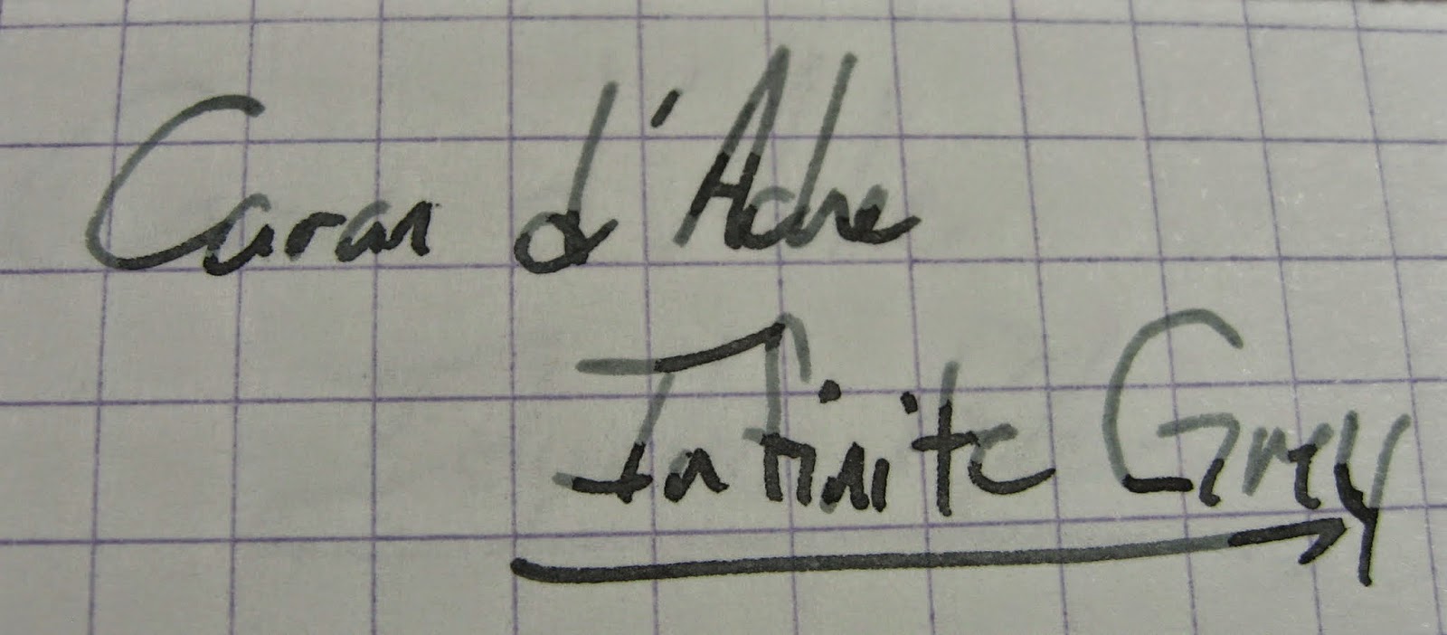 This is an ink that might be awesome. I'm not sure how I feel about it, but that dark, steely grey is pretty slick if you can get your pen to put down enough ink to show it off. You can find bottles and samples over at Anderson Pens. A 50ml bottle goes for $36.