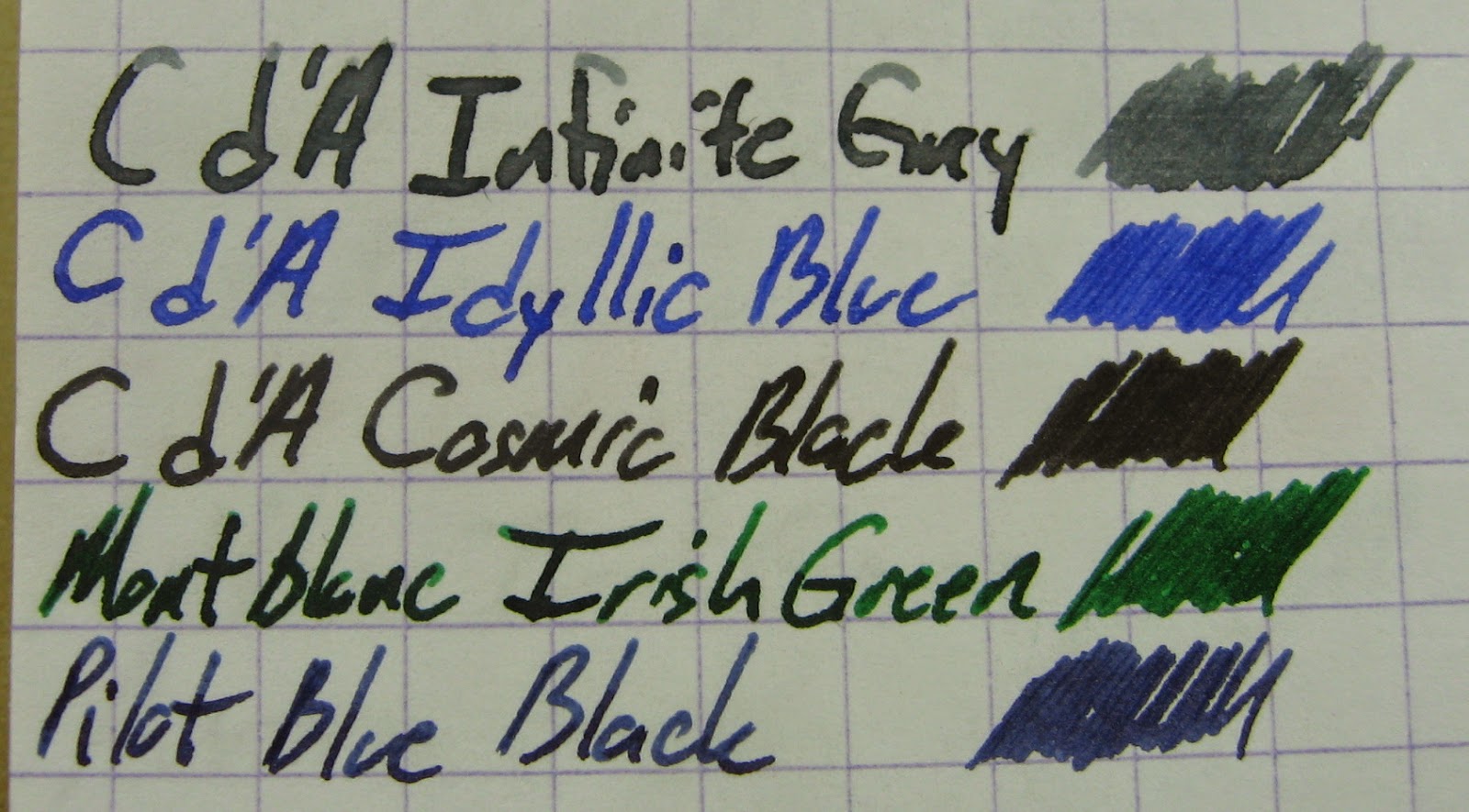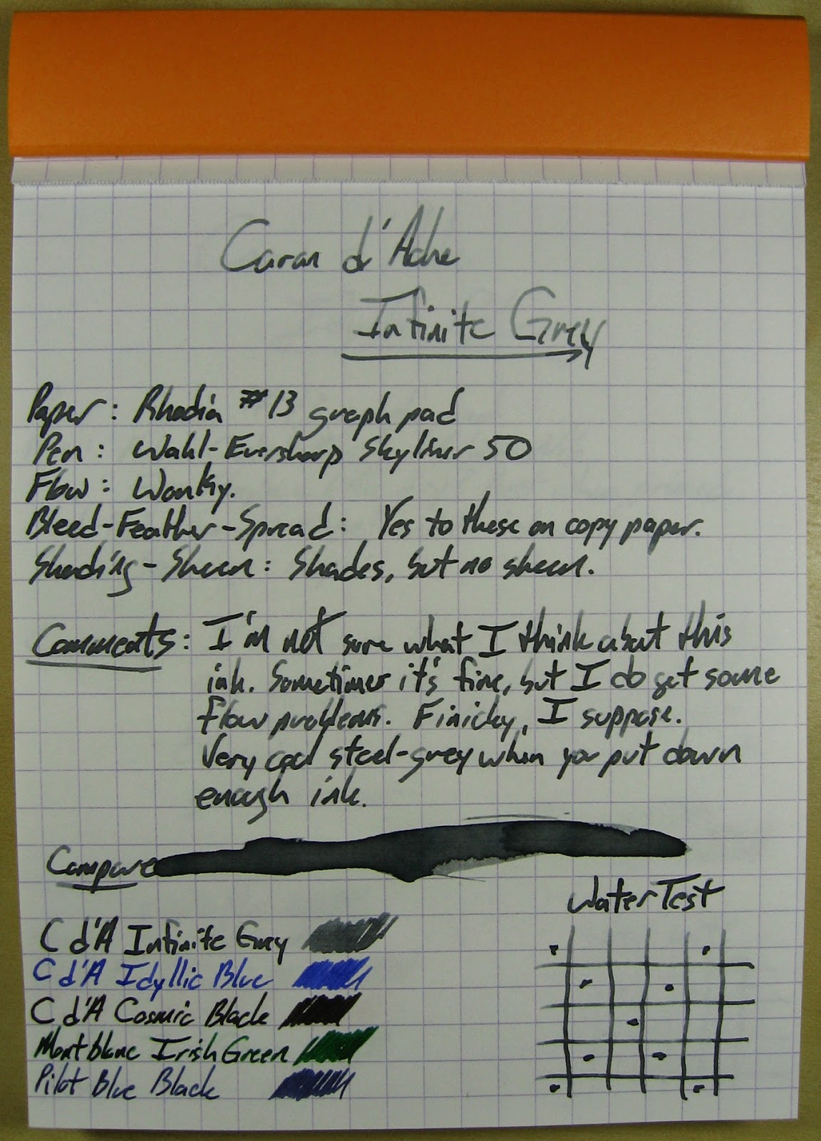 This one is a weird one. The text at the top of the page (below) is a lot like what I was normally getting when I wrote with this pen. I primed the piston a little bit, and it looked a bit better. On copy paper, this ink tends to run somewhat dry, but it can be a little wet on Rhodia. I don't know what's going on with this one, but I'm not a huge fan. the steely grey that you see in most of the text is very cool, but you can see in the shading areas the really light color that you get most of the time.