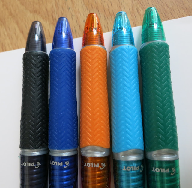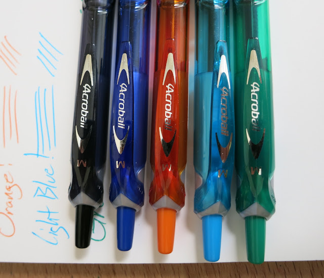 Ready for some ballpoints? You know...those things that you sometimes use when a fountain pen just won't work, or those things that you had to other people when they ask to borrow a pen? Well, some of them are much better than others. I'm a fan of these Acroball pens. Originally I could only find them in black (Pure White was the model that I had), and then I found the translucent blue ones. Now, though, there are lots of ink colors.