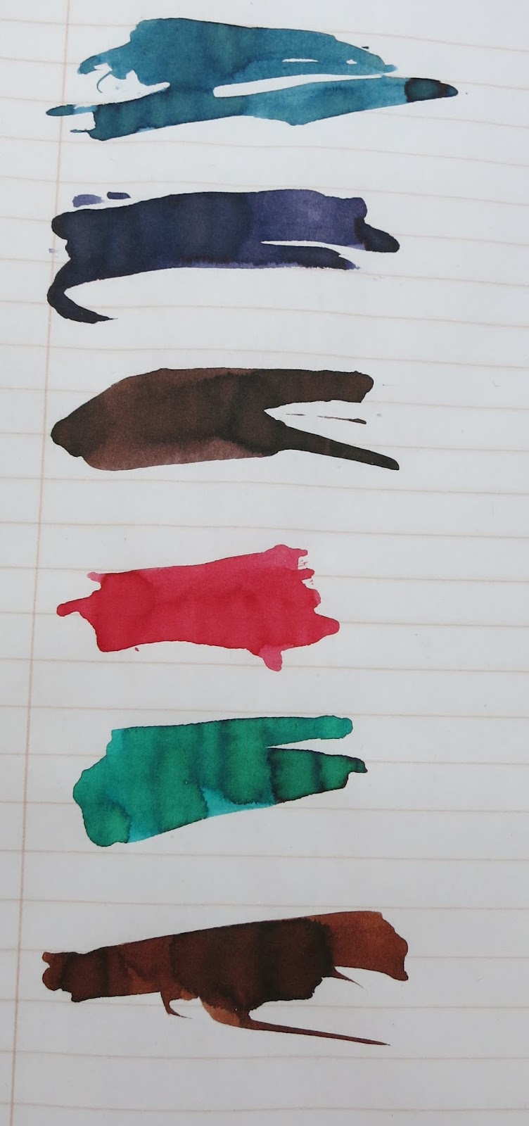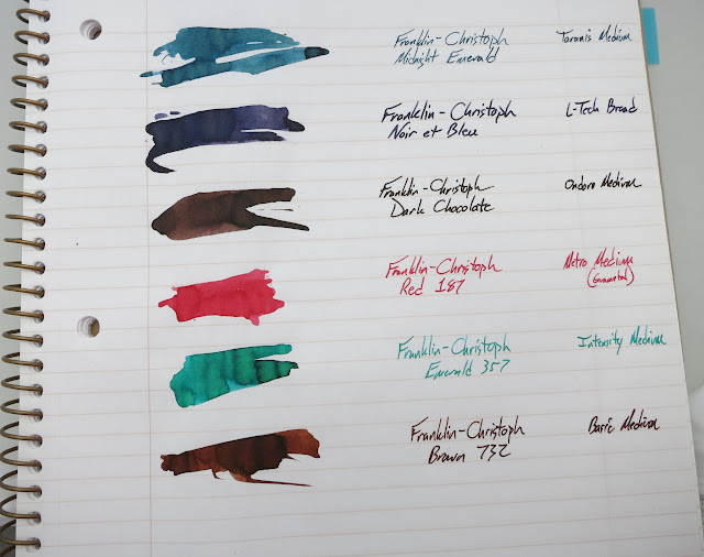 Franklin-Christoph inks! Yep, they've got 6 new inks for me to show you, and they all look kinda rad. One blue/black, one blue/green, two browns, a green and a red? That's a solid collection of inks. There's no black here, but that's okay with me. There are plenty of excellent blacks out there, and I appreciate the more interesting colors that they've gone with. I don't have any idea who makes the ink for F-C, but they bottle it in-house.