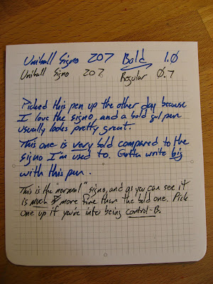 I'm sure that everyone has seen and used a Uniball Signo 207. They've been around for several years, and they're really good pens. I've used them in their regular (.7) and Micro (.5?) versions, and both are quite good. This one is much thicker than the other two, and much thicker than the other 1.0 pens that I've used in the past. It's boss.