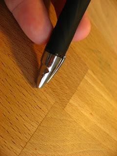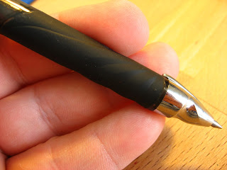 They really went for a more futuristic style on this pen, and I think it missed the mark. I don't mind the diamond-pattern in the barrel or the clip, but the grip and the plastic bit by the tip are big misses. They are uncomfortable for me since I tend to grip near the point (I'm so used to saying "nib") because the little plastic point pokes me in the finger tip and the rubber grip section seems to be backwards. It's smooth on the top and bumpy on the bottom. Weird. I think that if they'd flipped the grip over and made that plastic ridge a bit longer it could have been a much better pen.