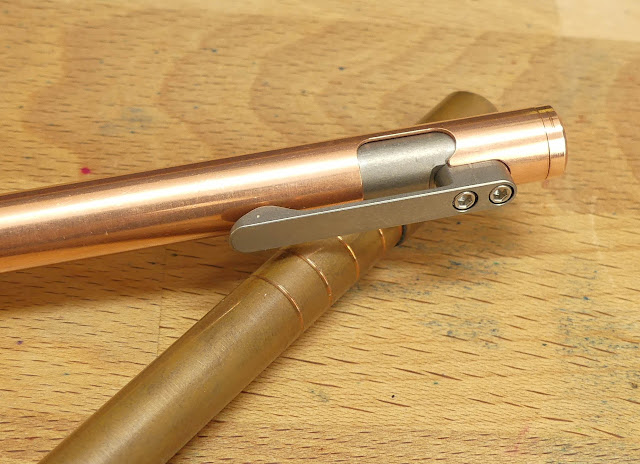 The clip and carrier in this pen is made from titanium, regardless of the metal of the pen. It looks good against the copper of this pen, and I bet it looks good against the brass, too.