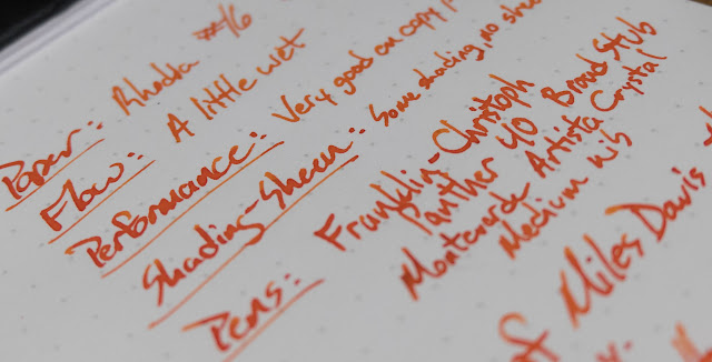 While the color on this one is awesome, it's not a perfect ink. I had some issues with this one drying out in my nib when I didn't use the pen for a couple of days, and it was doing that in a Franklin-Christoph nib that never has that issue. Weird. Once it gets going, the ink is fairly wet, but that drying-out issue is a problem.