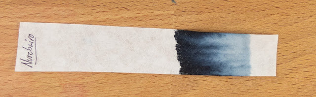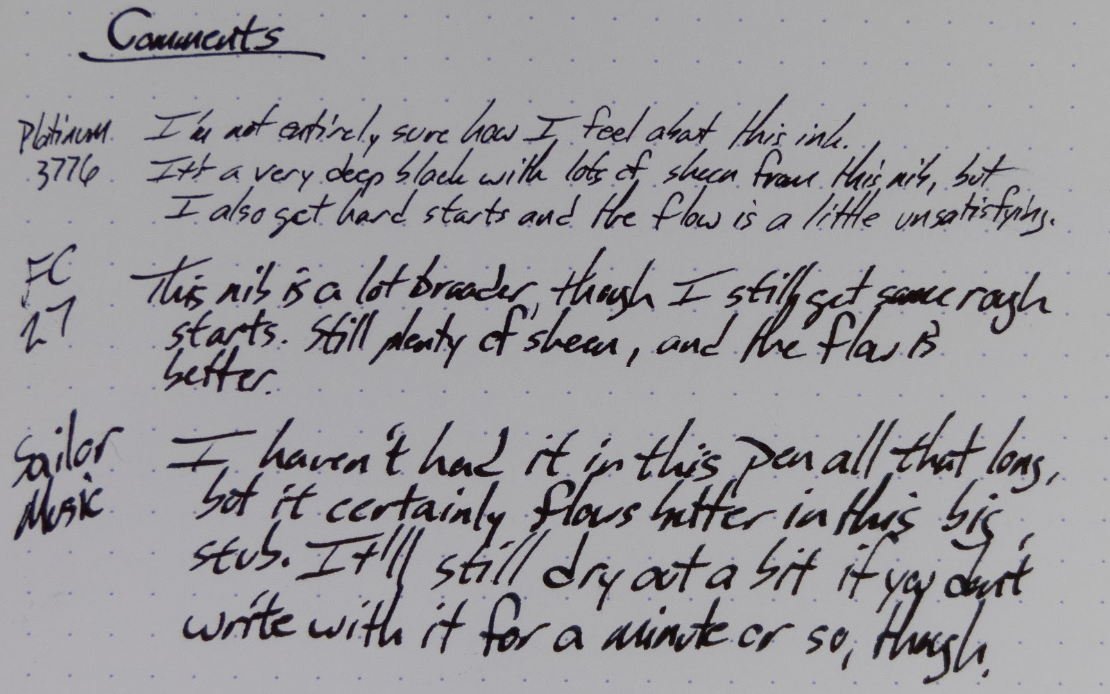 I've got it in three pens right now, and it's only really working well in one of them. They're all fine once they get going, but this ink has a habit of drying out in the nib if you pause in your writing for too long. More details below, but I think this is an ink that is best used in a broader, wetter nib.