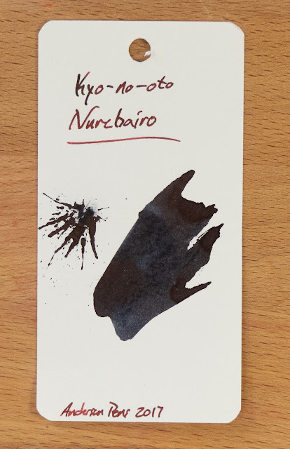 I've reviewed a couple of the inks from the TAG shop in Kyoto before, but none from this line. There are two lines of inks that they make (Kyo-Iro and Kyo-no-oto), and this is the first from the Kyo-no-oto line that I've tried. It's a somewhat deceptive ink, actually, and I've been using it off and on since about January of this year. In fact, I've used up just about every drop of this sample that Anderson Pens was kind enough to send out to me.