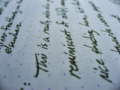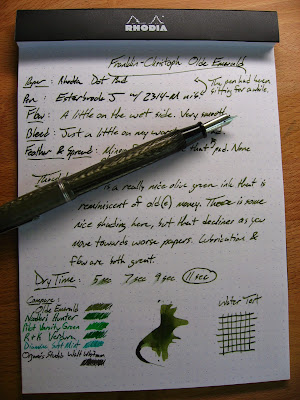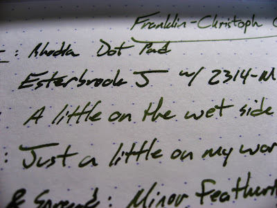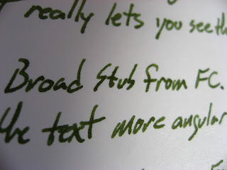 Here's the second of the 5 Franklin-Christoph writing fluids. I would say that this one is a little bit better than the Dark Denim. Some people find Dark Denim to be a bit under-lubricated, though I didn't. Olde Emerald, on the other hand, doesn't seem to have that problem at all. I've used it in several different sorts of nibs (including a whole raft of Franklin-Christoph nibs that I picked up for my Collegia), and it has worked well in all of them.