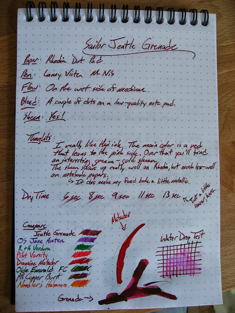 Sailor's Jentle Grenade is a dark maroon color, that looks a bit like a red wine. It behaves well on the papers I've tried it on, though you'll find a few dots on the back of cheaper papers. I say (in the review below) that the flow is on the wet side of medium, but I need to mention that this ink does seem to dry up in my nib faster than I like. It was a bit of a hard-starter. That's a little annoying to me. It's one of the things which makes me hesitate to hand someone a pen filled with this ink. It looks cool, but if they put the nib on paper and it doesn't write they're going to get a bad impression of the pen, and perhaps fountain pens in general.